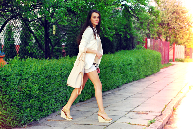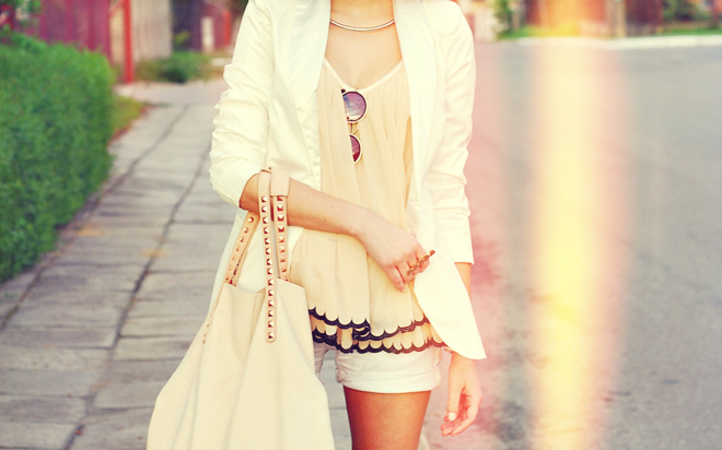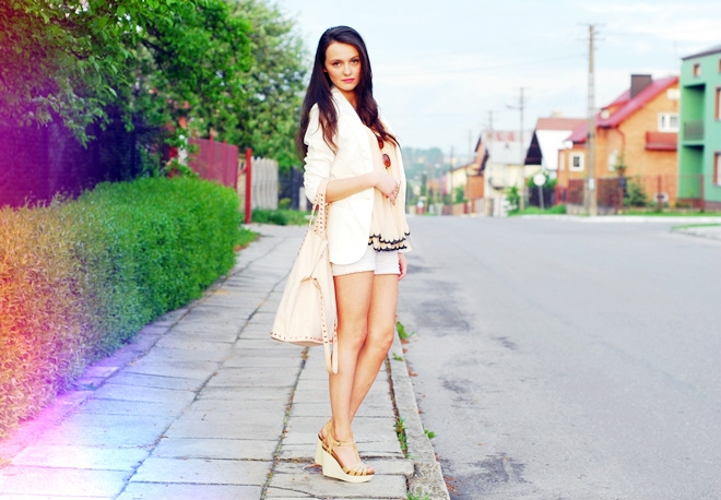 Dzisiaj mix bieli z bardzo jasnym, pudrowym różem. Mocniejszym akcentem są tylko znane już wszystkim okulary i wykończenie topu.
