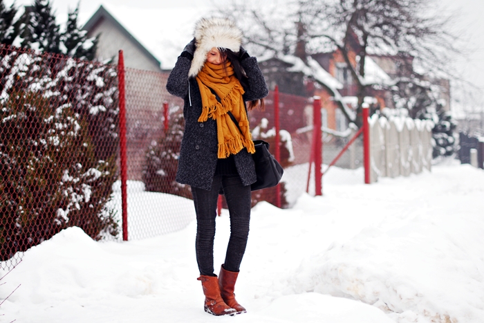 Tak właśnie wyglądam, kiedy próbuję poradzić sobie z mrozem. Ogromna czapka, wielki szalik, dwie pary rajstop, grube skarpety (botki o rozmiar za duże to mój sekret na krytyczne zimowe momenty!) i ciepły płaszcz, pod którym chowam przynajmniej dwa grube swetry. Wizualnie nie powala, ale na zimowy spacer jest idealnie. Hope you like it!