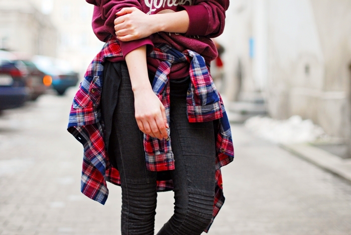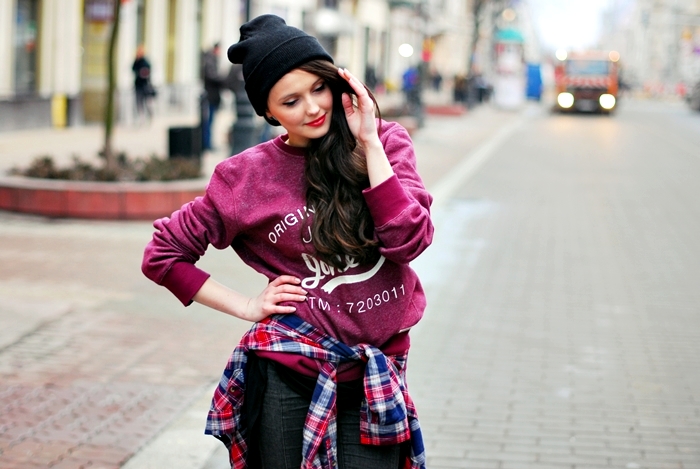 Męska bluza to moje ulubione rozwiązanie na zimne, ponure dni. Ta tutaj to moja ulubiona - ma bardzo przyjemny materiał. Zestaw z tą bluzą i spodniami już kiedyś pojawił się na blogu, tym razem trochę go zmodyfikowałam - koszula w kratę przewiązana na biodrach nadaje lekko grunge'owego charakteru stylizacji. Koszulę znajdziecie w Reserved, bluza jest firmy Jack&Jones, rzeczy tej firmy można kupić np. w Zalando.pl. Czapkę kupiłam spontanicznie w sklepie "wszystko po 1,23 zł", kiedy podczas powrotu do mieszkania z uczelni dopadł mnie deszcz. :D Hope you like it!
